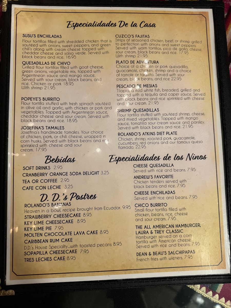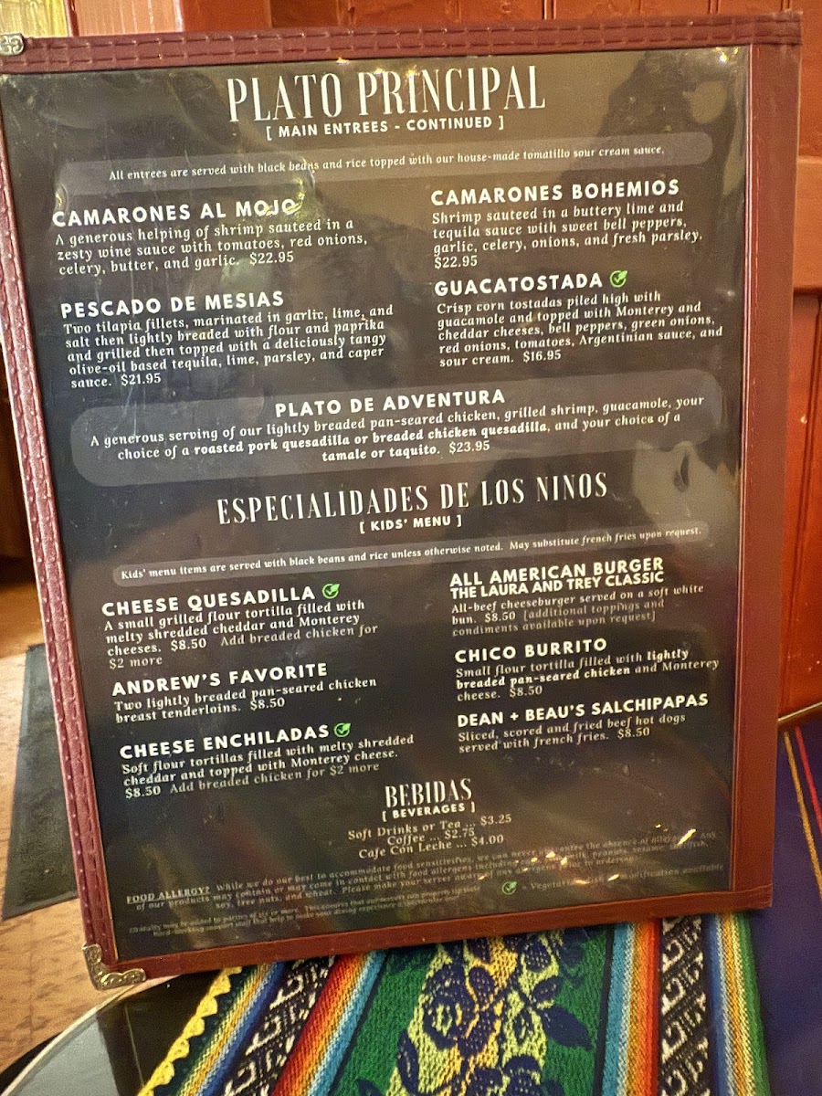 Shrimp sautéed in a lime and tequila sauce with sweet peppers, onions, and parsley. Served over rice with black beans, sour cream, and cheese.