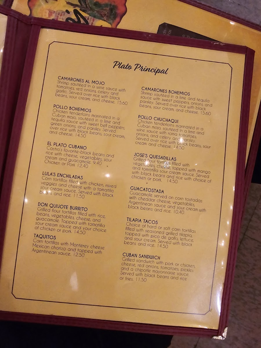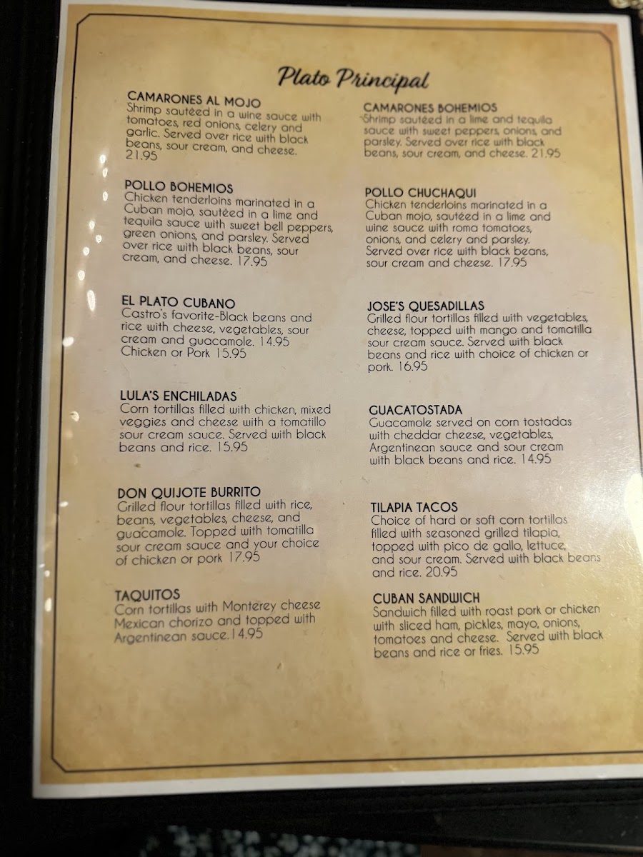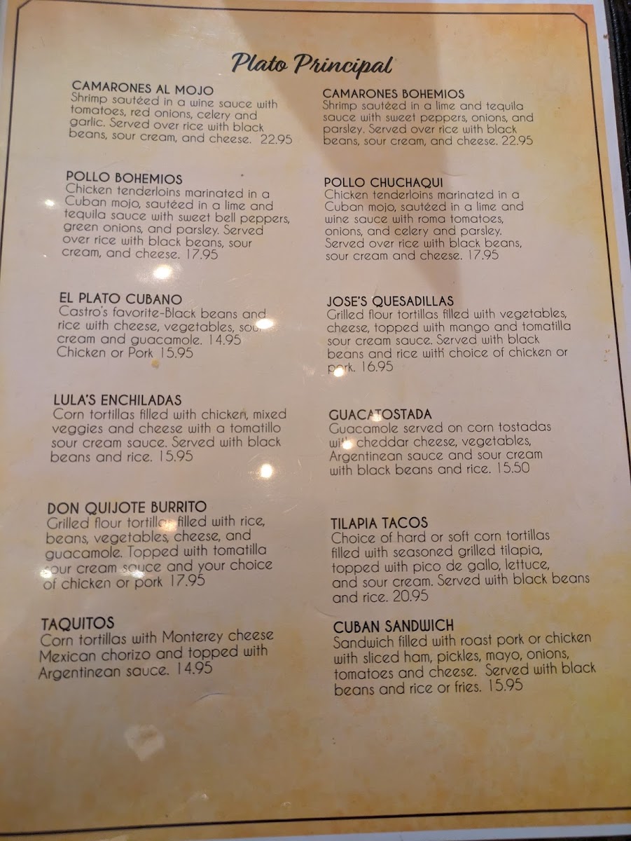 Chicken tenderloins marinated in a Cuban mojo, sautéed in a lime and tequila sauce with sweet bell peppers, green onions, and parsley, and served with rice, black beans, sour cream, and cheese.