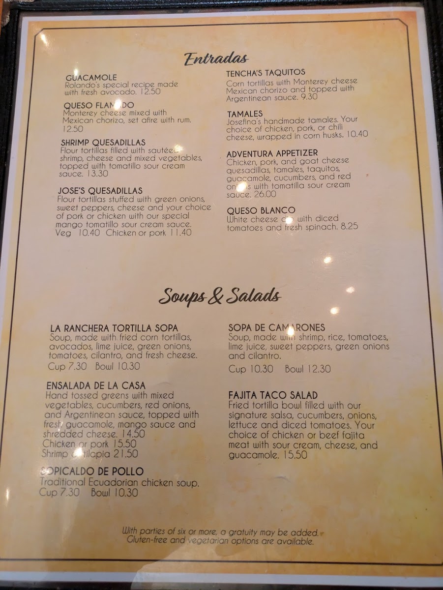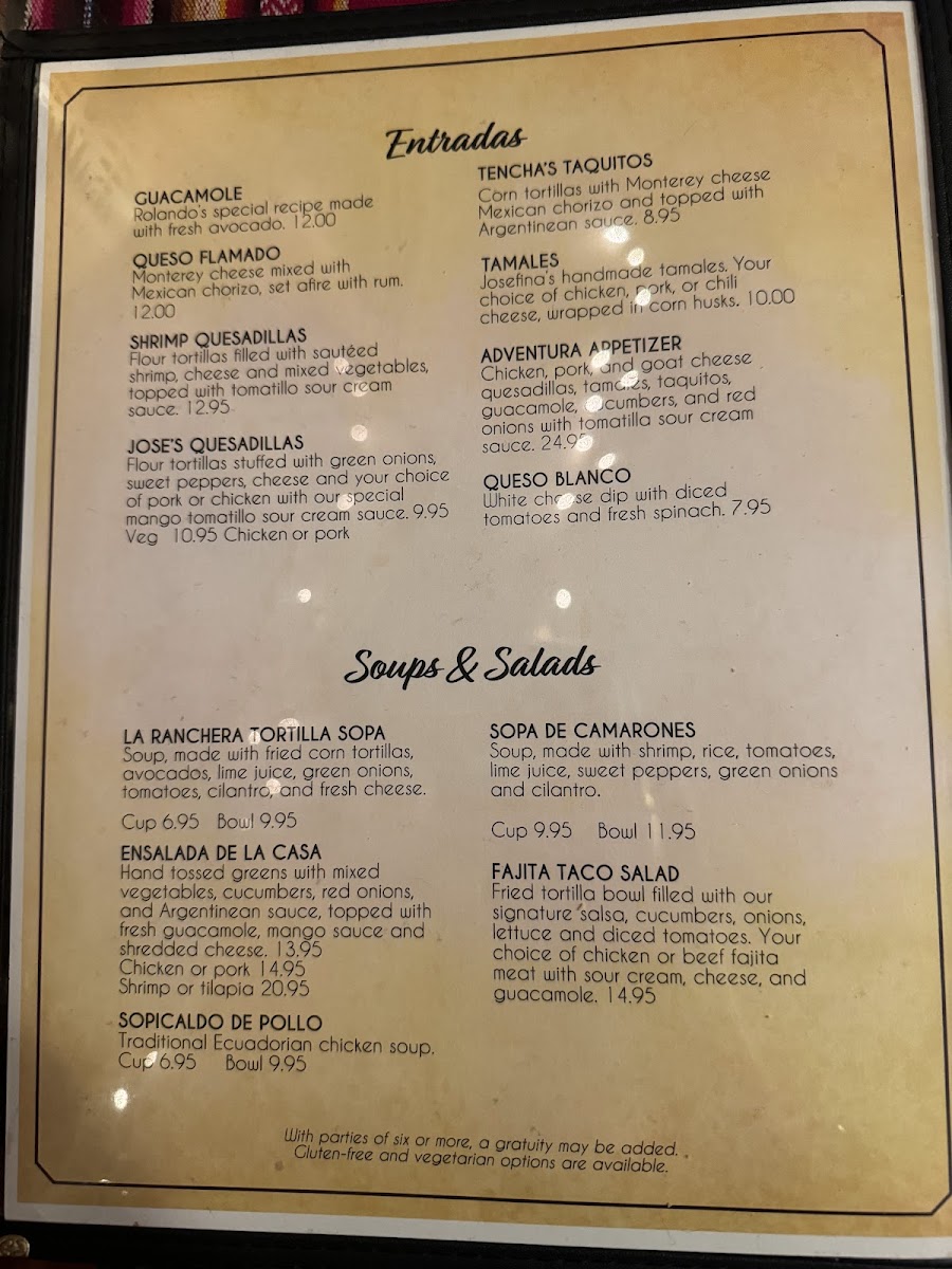 Flour tortilla stuffed with sautéed shrimp, cheese, and mixed vegetables, topped with mango sauce, tomatillo sour cream sauce, and parsley, and served with black beans and rice.